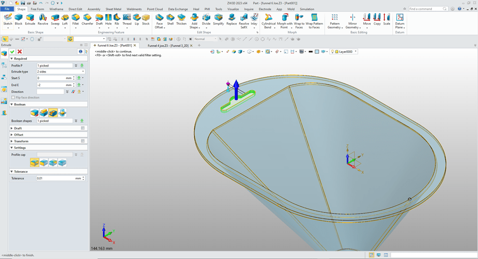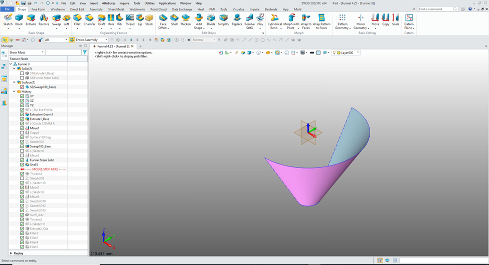 Now this is where the lack of “Design Intent” shows its ugly face. Would I have designed with surfaces? No. But Craig wants to learn the advanced surfacing functionality of ZW3D because he is in the business that designs Kayaks. So he probably wasn’t thinking in solids only. ZW3D has integrated solid/surfacing using many of the same commands with just an option if it to be a solid or surface.