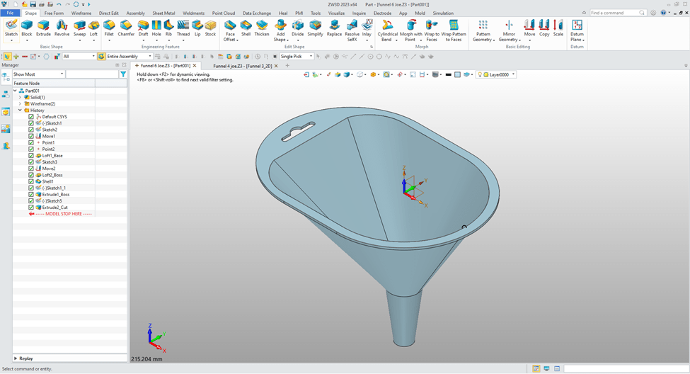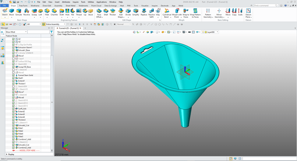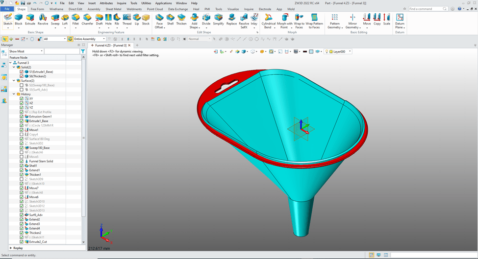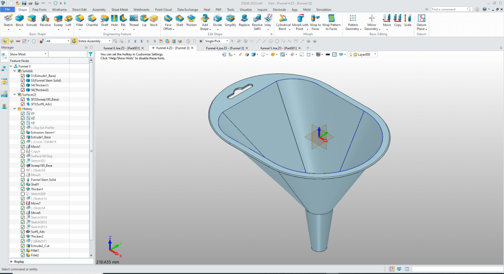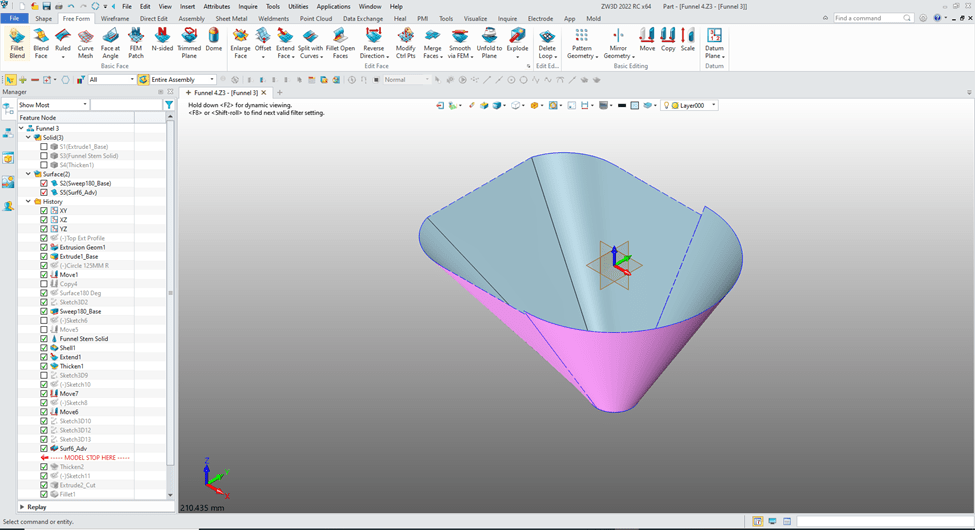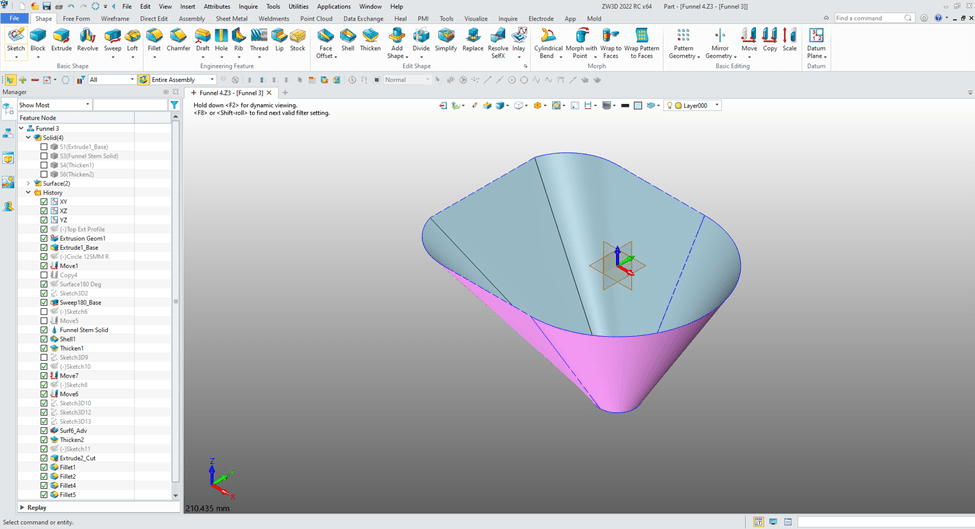 I decided with my knowledge of ZW3D starting with the funnel shape would be the most optimum way of creating part.