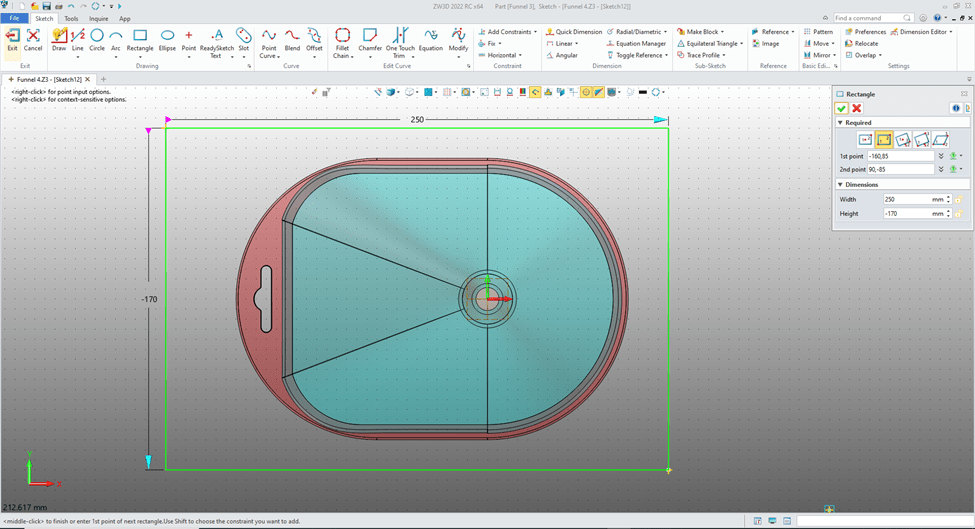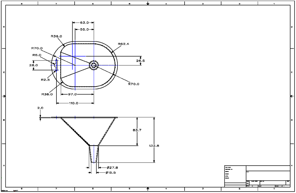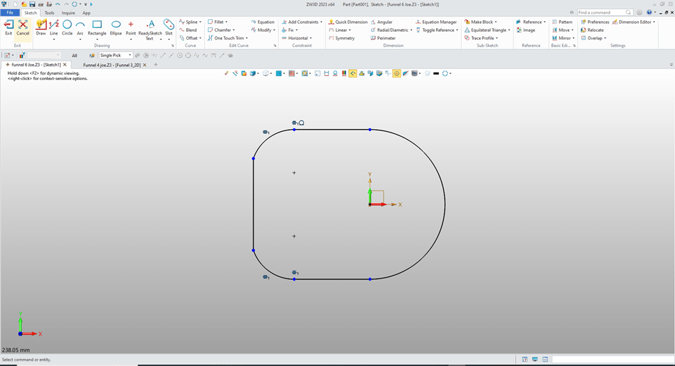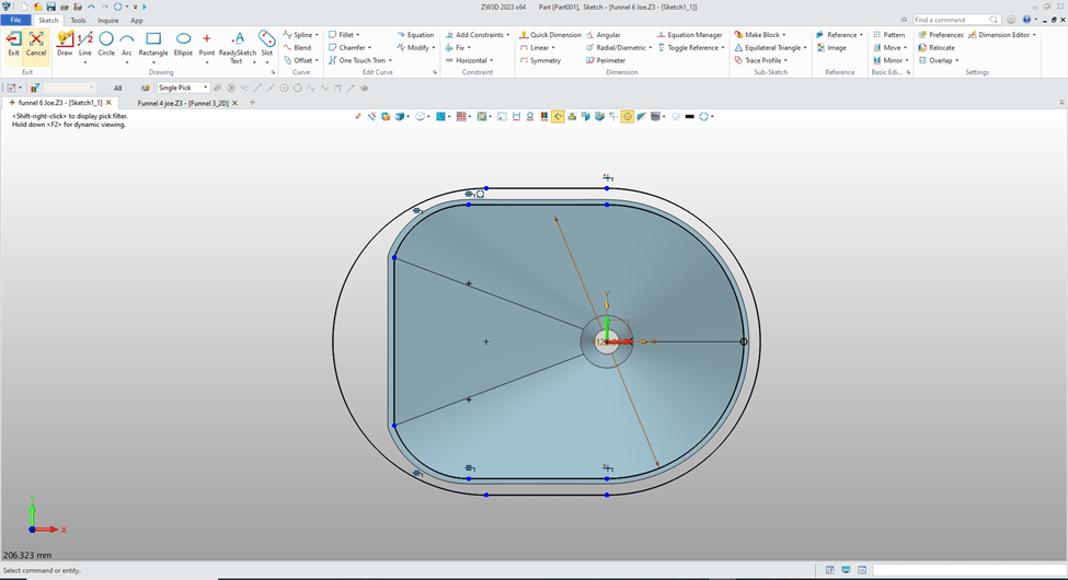 I create a sketch of the top of the funnel. As you can see I do not use constrained sketching. Most graphics are create with parallel lines and using the entities for reference locations. I call this “StreamLined Sketching”.