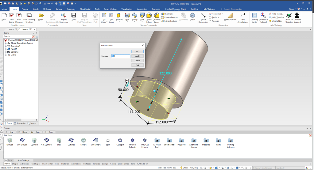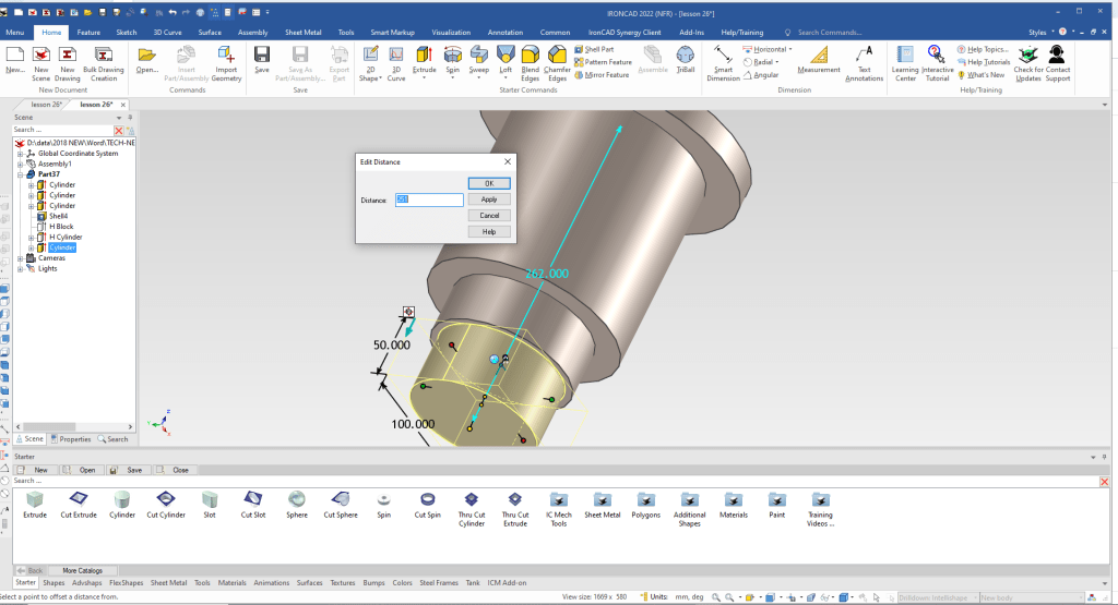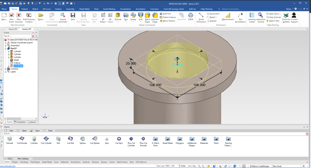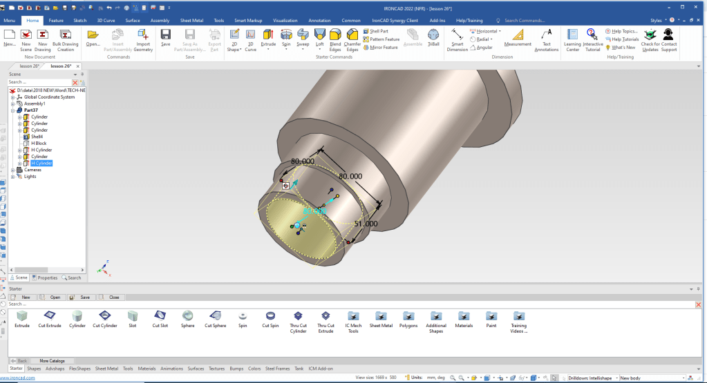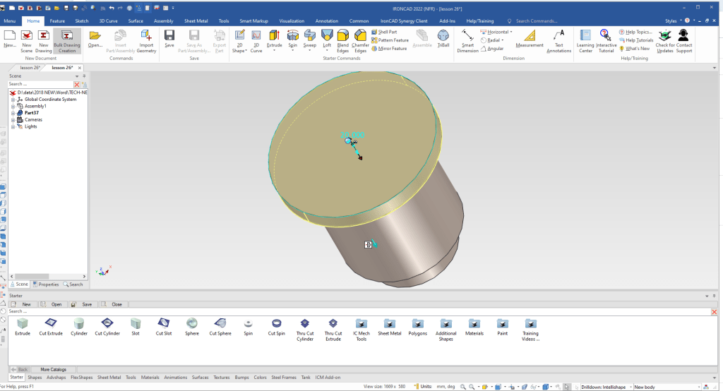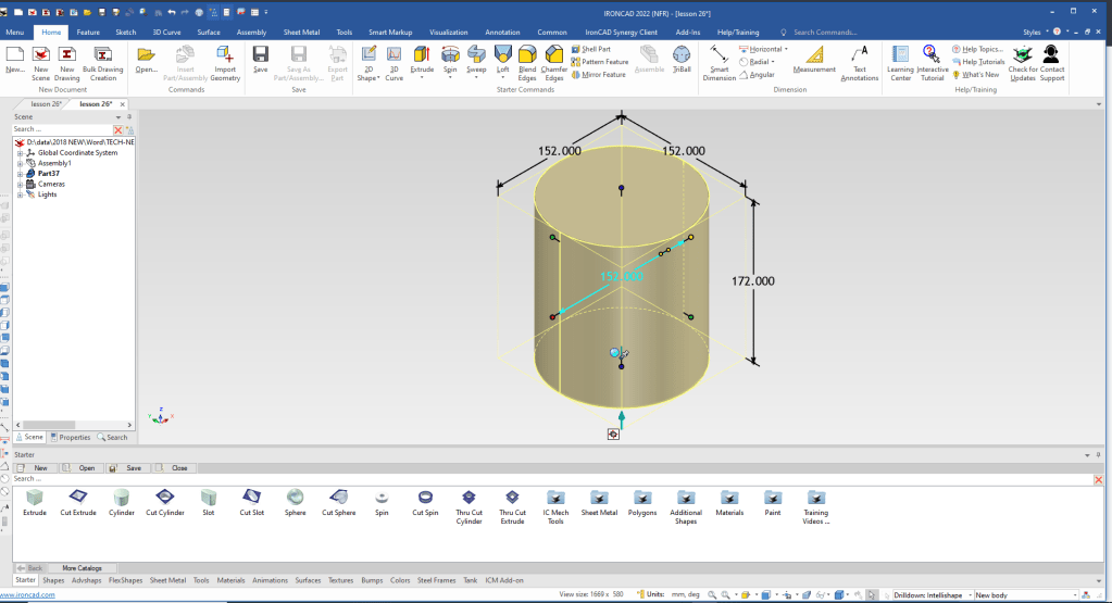 We drag and drop a cylinder the center of the existing cylinder and size it. IronCAD allows you to set the handles a specific distance from another feature. We will set it 212 mm form the top circular edge.