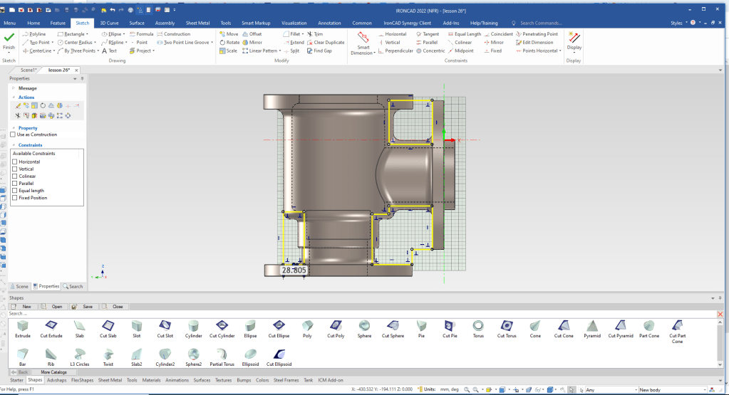 Most of your are use conventional constrained sketching and would not recognize that this shape at this level has consistent wall thickness. To an experiences “Feature Based” he realizes he can shell the shape, there by cutting much of the modeling time.
