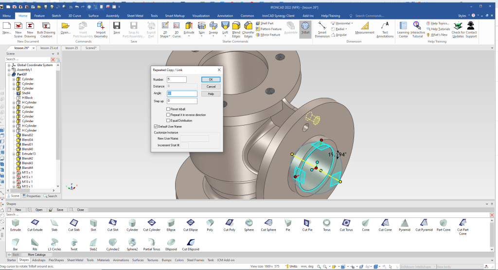 Now for the holes in the vertical flange. This time we don’t pattern them, we just copy link. I am just showing you the different features of the Triball. It is by far the most sophisticated feature, part, assembly manipulator available and offer huge option in design flexibility.