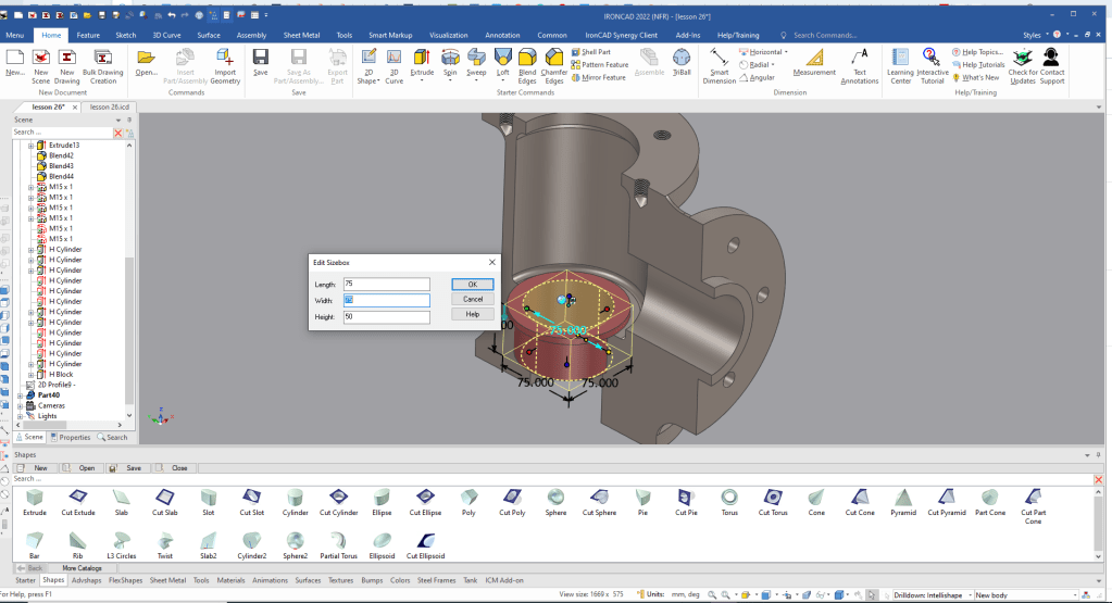 We click twice and go to intellishape, we flip the extrusion by selecting “Flip Extrude Direction”. We are still in the Intellishape level we select a handle with the right mouse button and select “Edit Size Box” and we size the feature