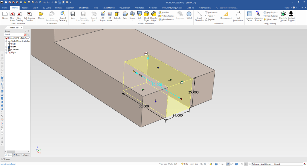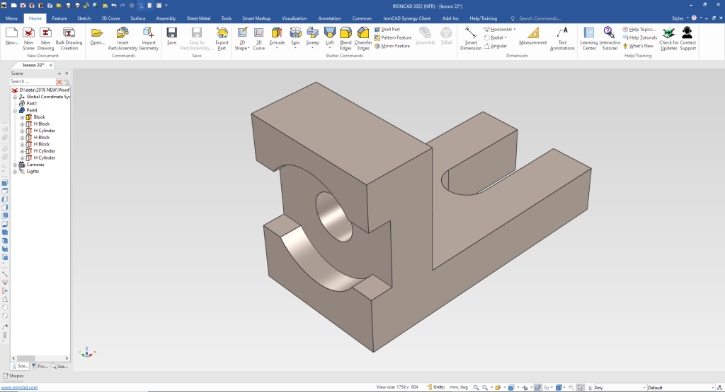 Note: Why does IronCAD call it a scene instead of a workspace? IronCAD was first released as a graphic design program called Trispectives. It still has much of the graphic design functionality. It truly is a wonderful mixture of professional 3D CAD and graphic design, which puts it in a much more flexible category as compared to the Pro/e (Creo) clones.
