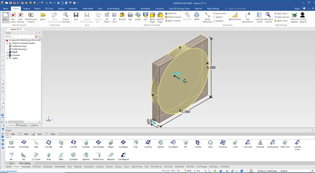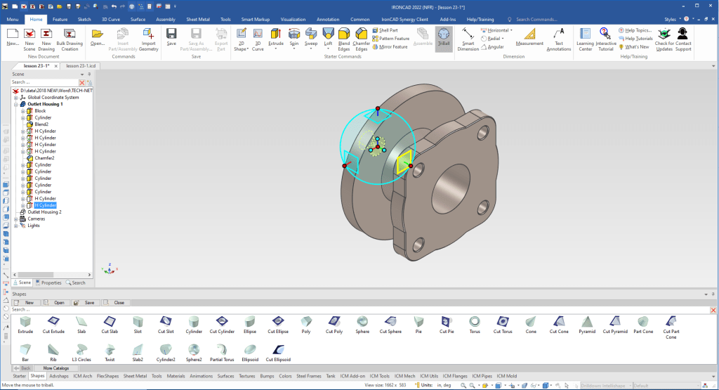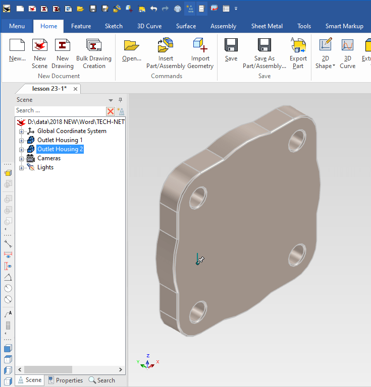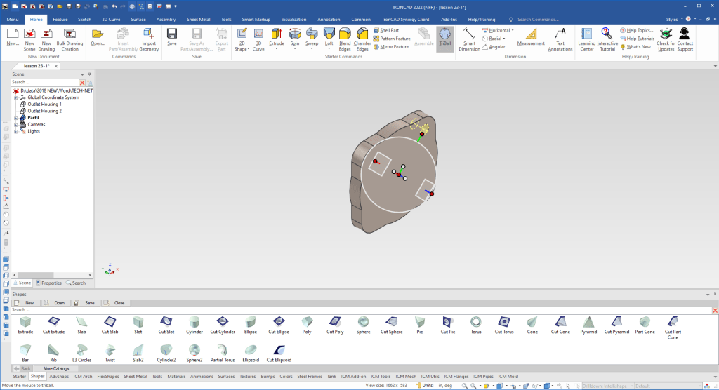 Note: Why does IronCAD call it a scene instead of a workspace? IronCAD was first released as a graphic design program called Trispectives. It still has much of the graphic design functionality. It truly is a wonderful mixture of professional 3D CAD and graphic design, which puts it in a much more flexible category as compared to the Pro/e (Creo) clones.