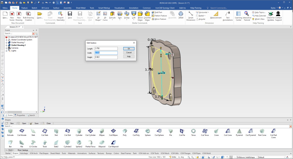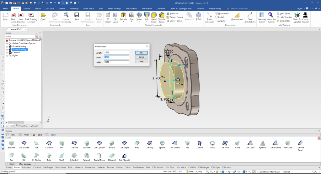 As we evaluate the drawing we can see the mating Outlet Housing 1 flange is made up of a square 4.742x .65 so we drag and drop a block from the shape catalog and size it.