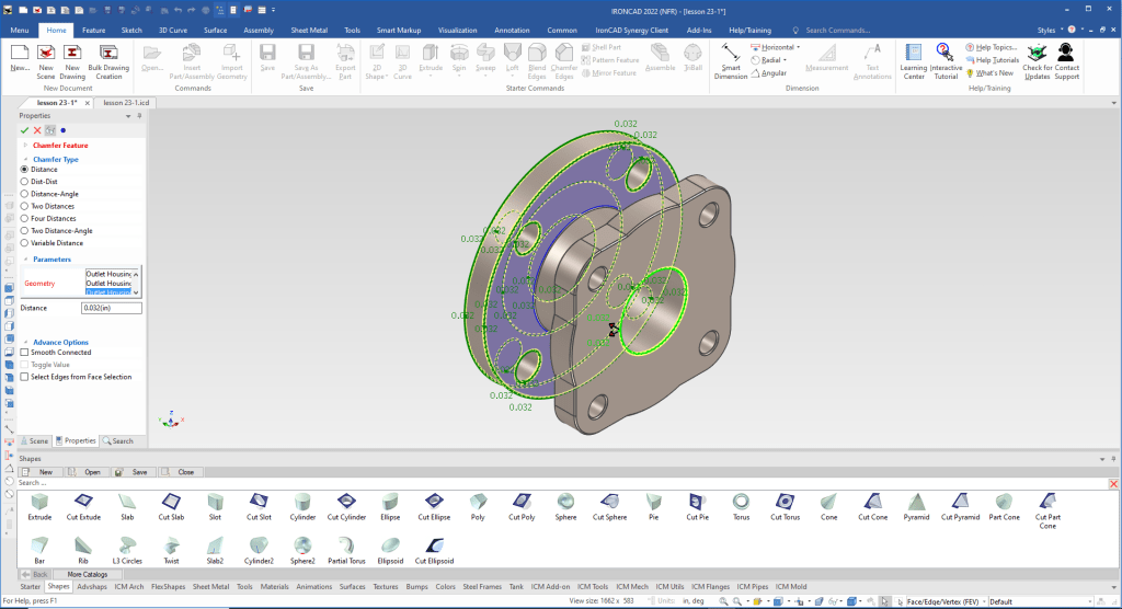 I added the chamfers at this time instead of creating them at the end like usually do because I we noticed that the Outlet Housing 2 has the exact same mating feature. I select the shape and copy and paste it and it created a new part. This is where a single model environment is superior to the separate files of Solidworks. You can see we have both of the housings in the same part.