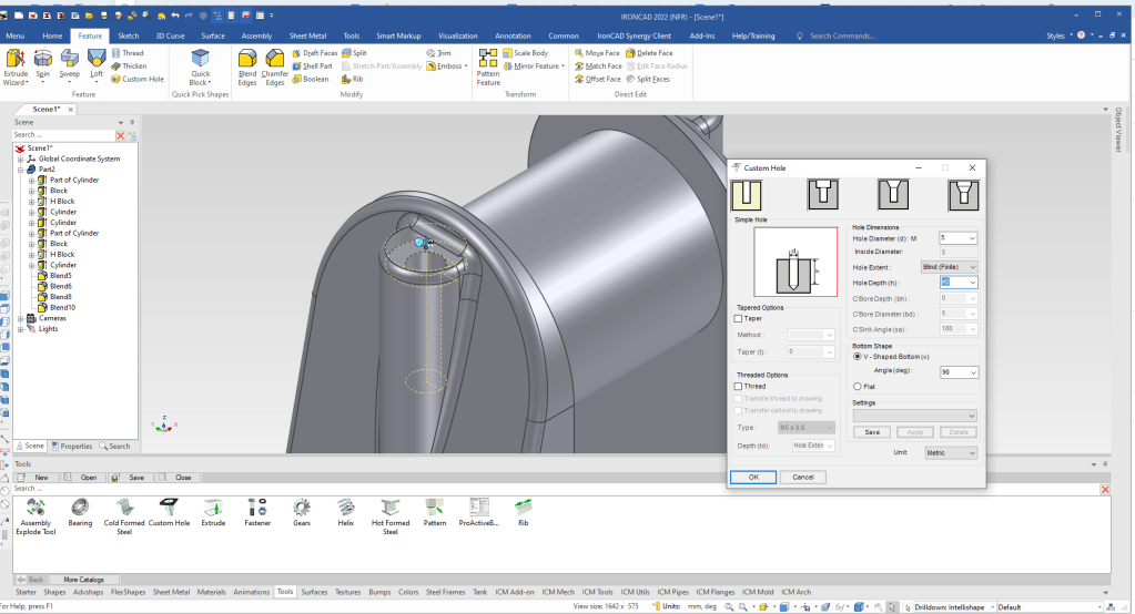 We will use the tools catalog and select custom hole. We will size it but make the depth 40 to make up for the blend. We will move it with the Triball.