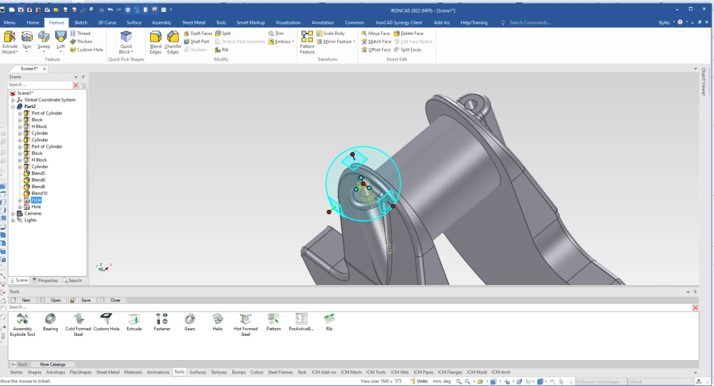 We now need to copy link the hole in the other end. Like we did with the chamfer we select the feature in the scene browser then the Triball, we move the Triball to the midpoint of the holes using the point to point option and we mirror copy link the feature.