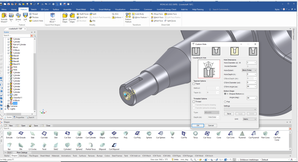 Now for the two holes in the bearing shaft. We drag and drop a hole to a parallel face, size it and use the Triball to locate.