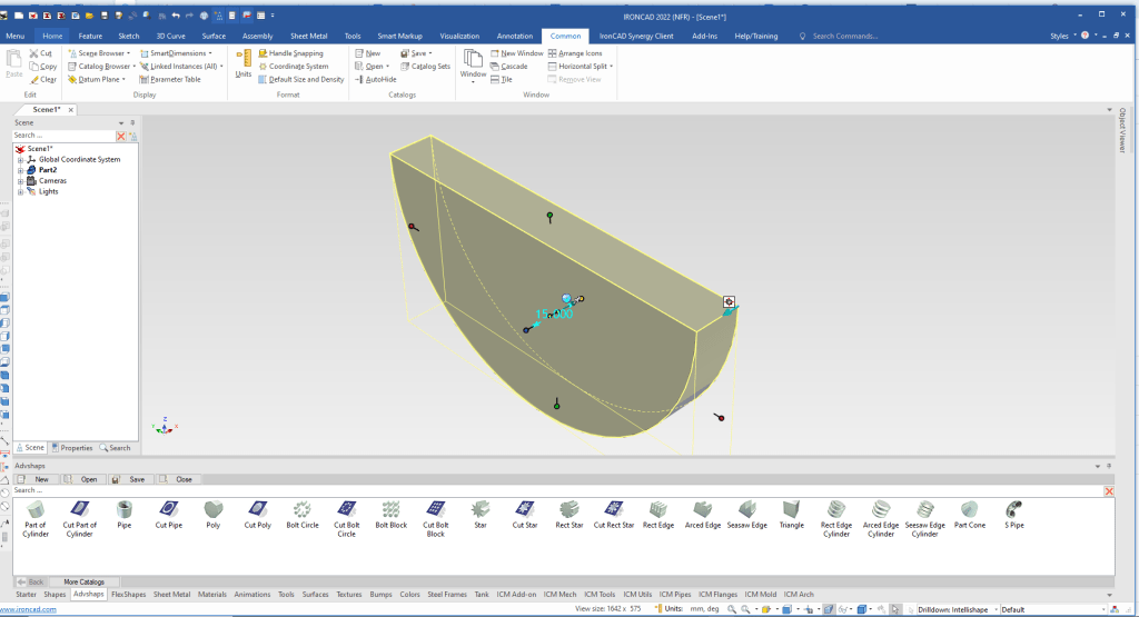 We will start by dragging and dropping a “Part of a Cylinder” from the “Advshape” catalog into the scene, orient it with the Triball and size it.