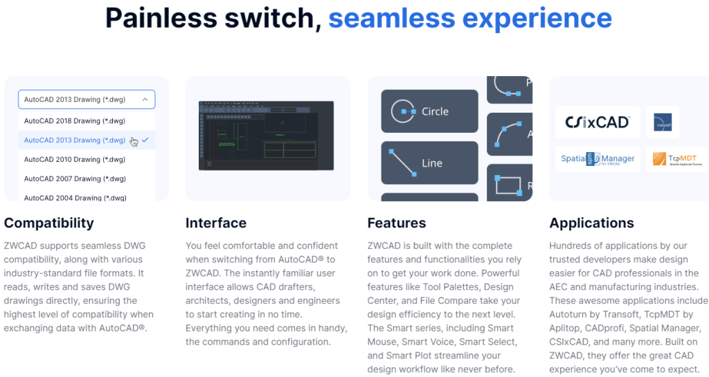 ZWCAD supports seamless DWG compatibility, along with various industry-standard file formats. It reads, writes and saves DWG drawings directly, ensuring the highest level of compatibility when exchanging data with AutoCAD®.