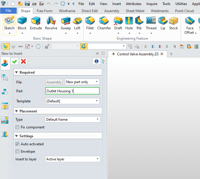 We will now select “New to Insert” and name the part “Outlet Housing 1”