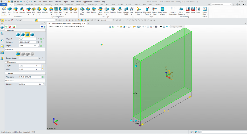 We insert a block and set it to 4.742 x 4.742 x .65 size it.