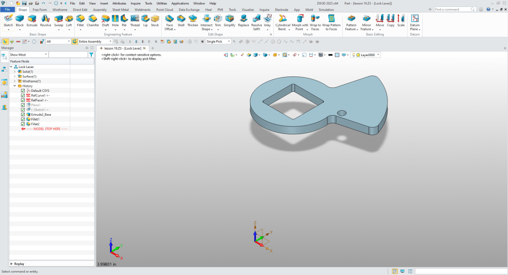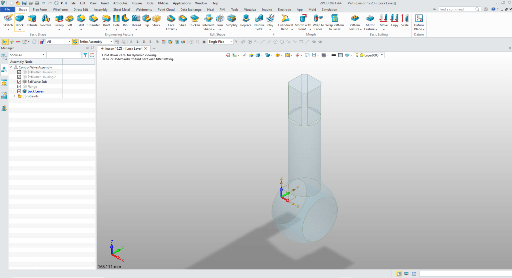We use the “New to Insert” command under the the Control Valve Assembly and name the part Lock Lever. We edit or activate the part. This how we design top down.