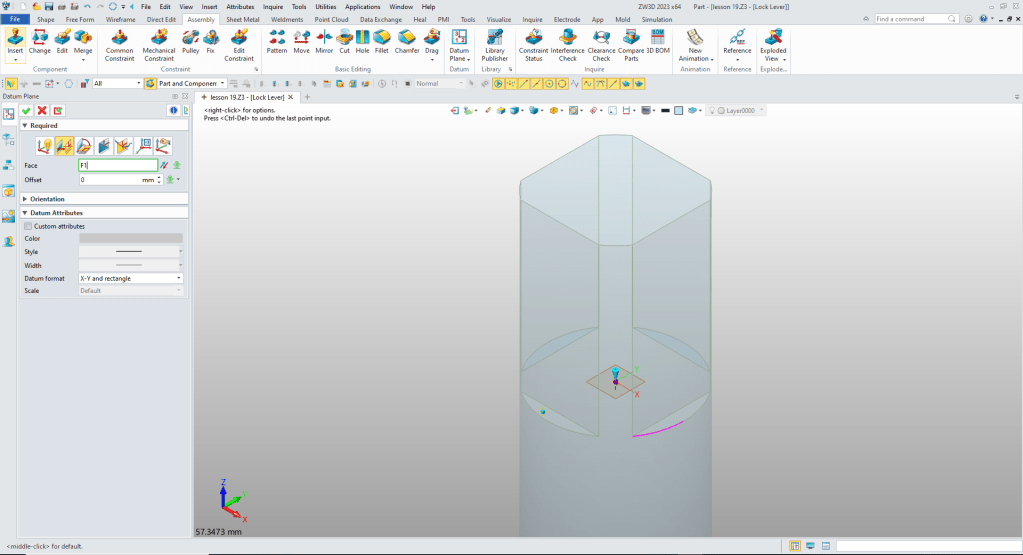 We zoom to the mating face and create a datum plane. We select the assembly tab. We create a reference curve to use to locate the plane.