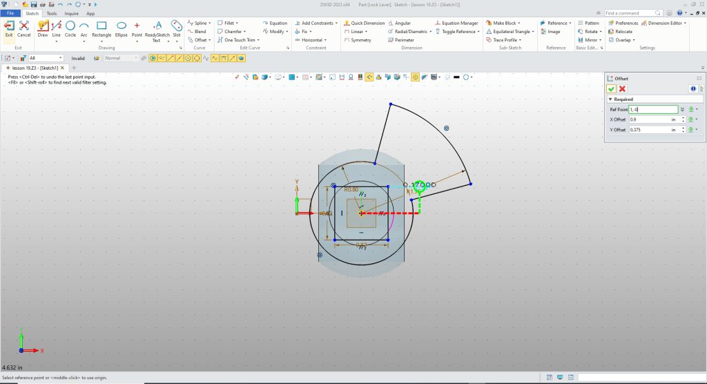 We select the offset option from the right button and put in the dims and we are done with the sketch. Not one constrained dimension.