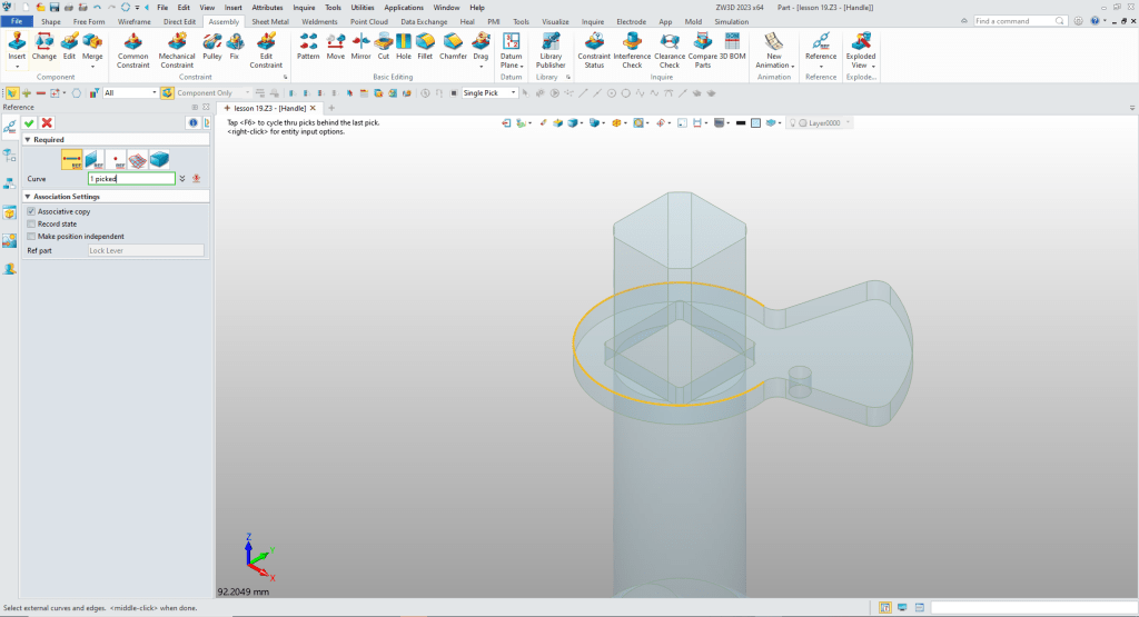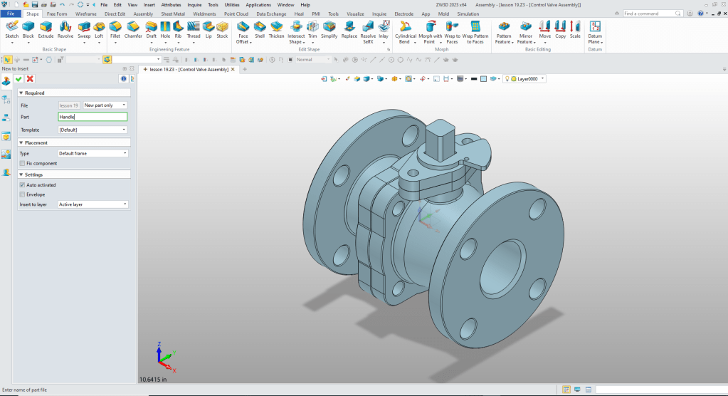 We use the “New to Insert” command under the the Control Valve Assembly and name the part Lock Lever. We edit or activate the part. This how we design top down.