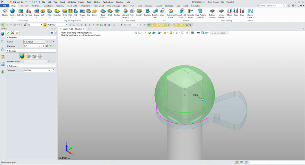 I quickly realize I did not do my design intent. So we will move the sketch and extrusion above the sphere. It makes the new extrusion a standalone shape, which means we have to set the sphere to add.