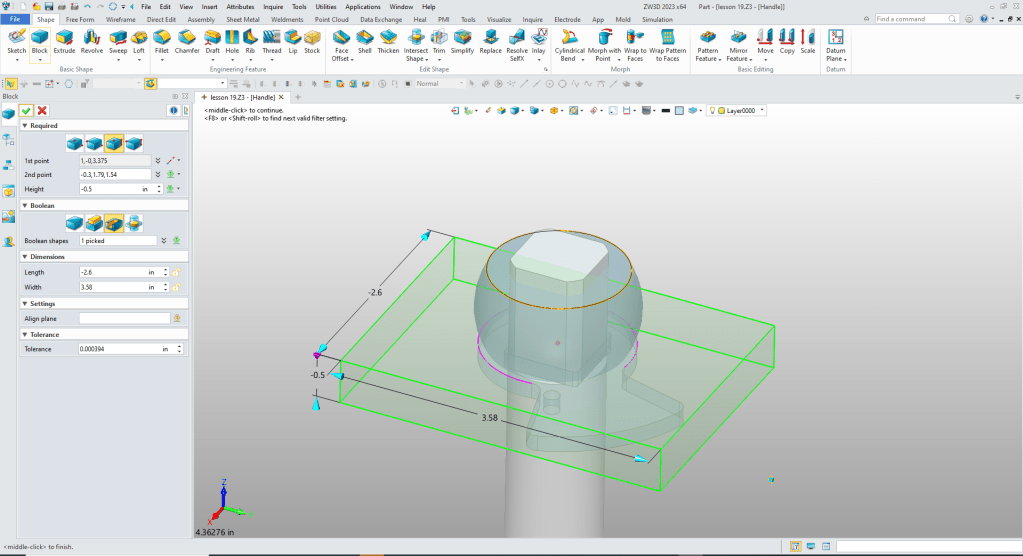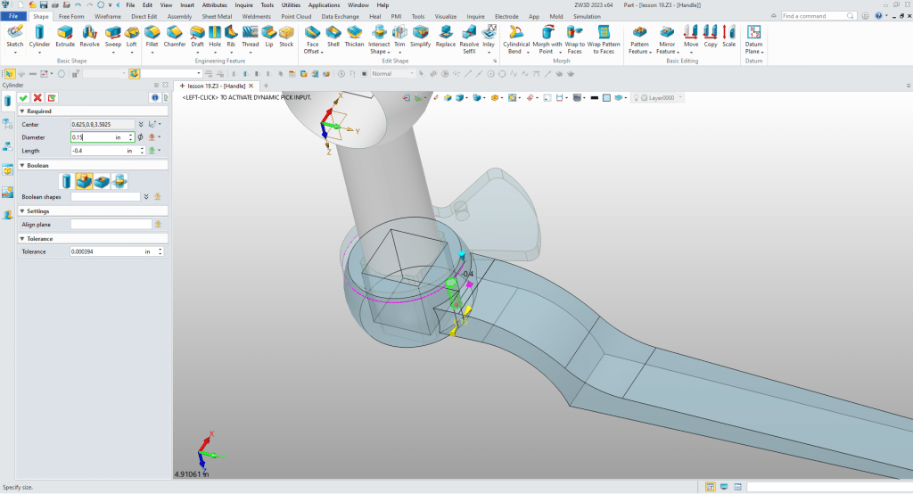 Now for the locking pin. We insert a cylinder locate, size and set it to add.