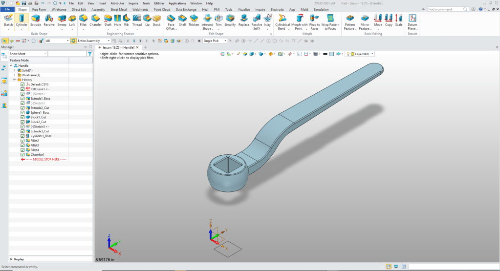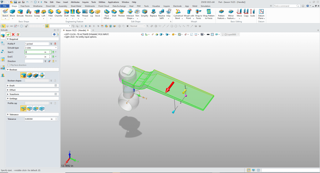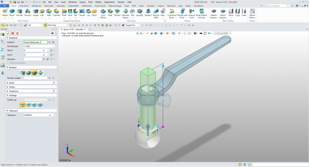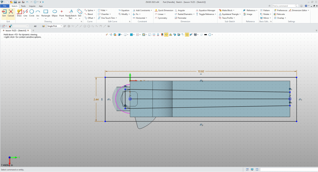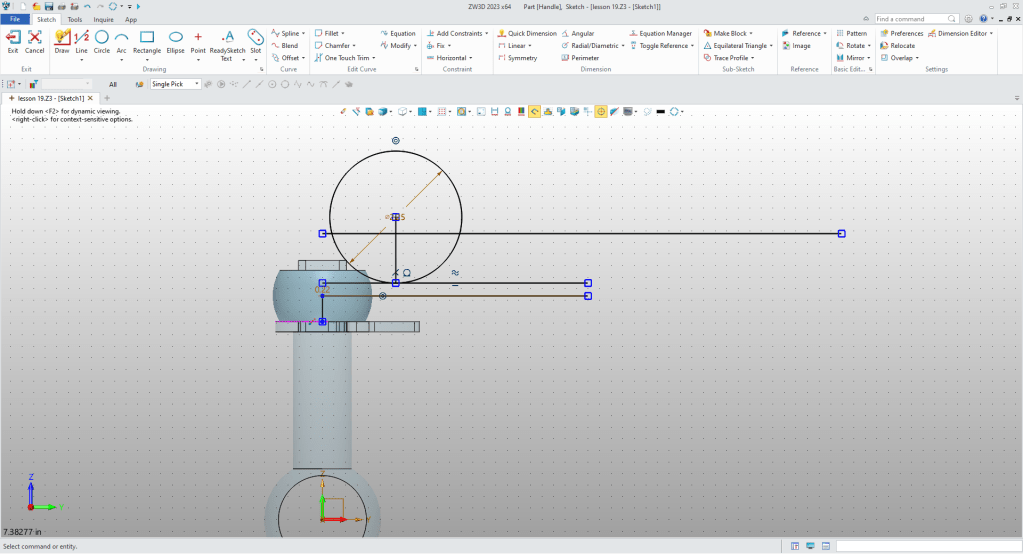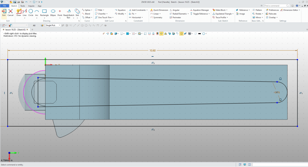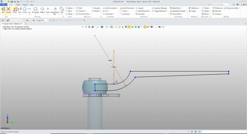 Now for the handle. We create a sketch on Y-Z plane. We use what I call StreamLined Sketching. No constraints.