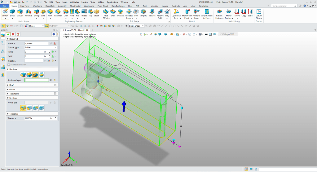 We delete the construction line and exit the sketch and create the extrusion size and set to remove.