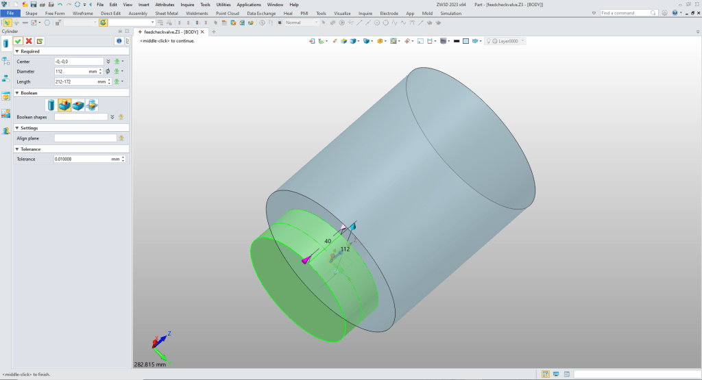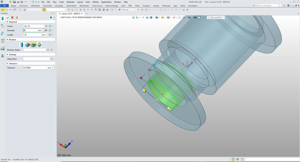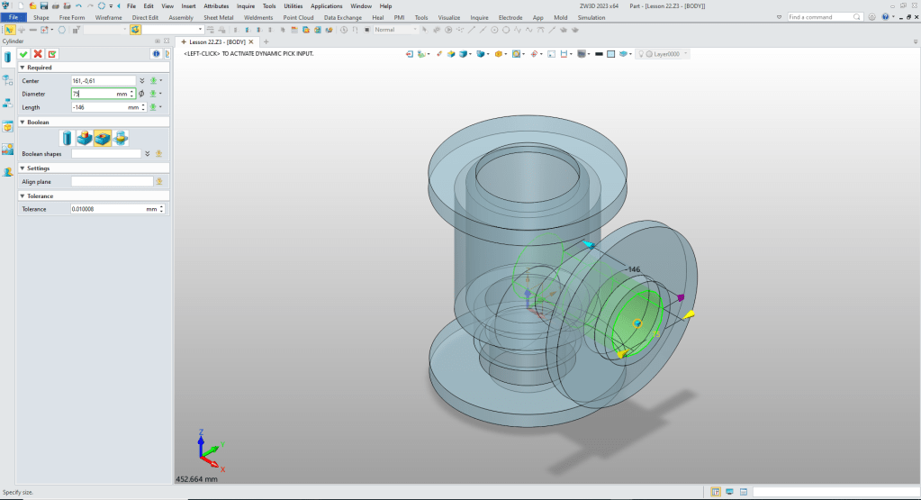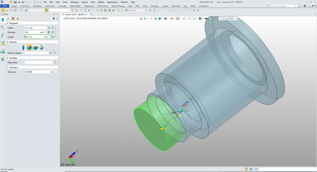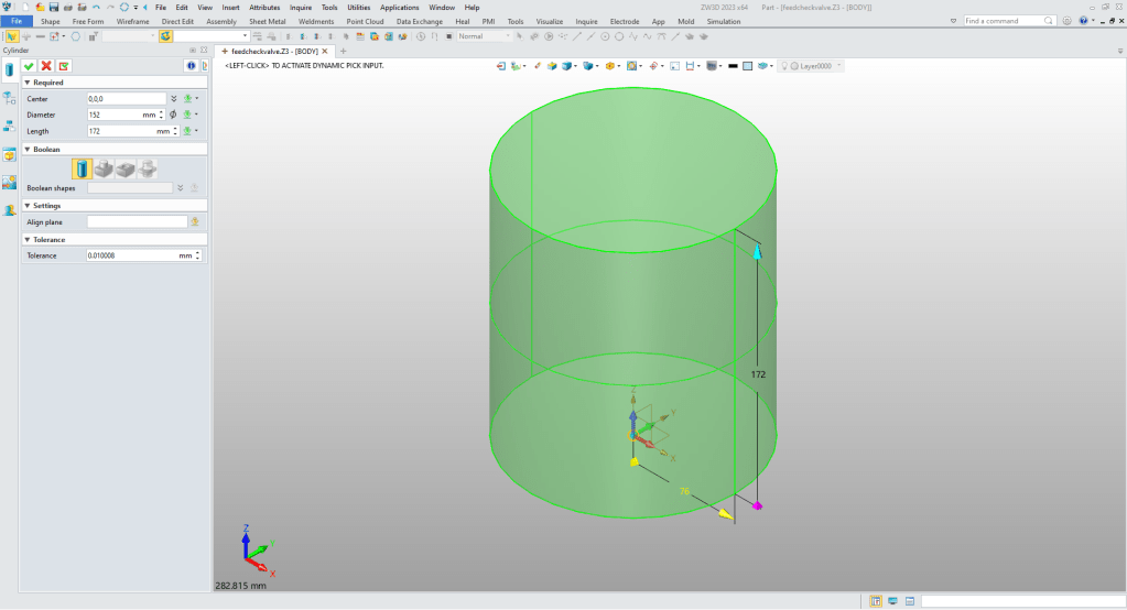We insert a cylinder at X0Y0Z0 and size it.