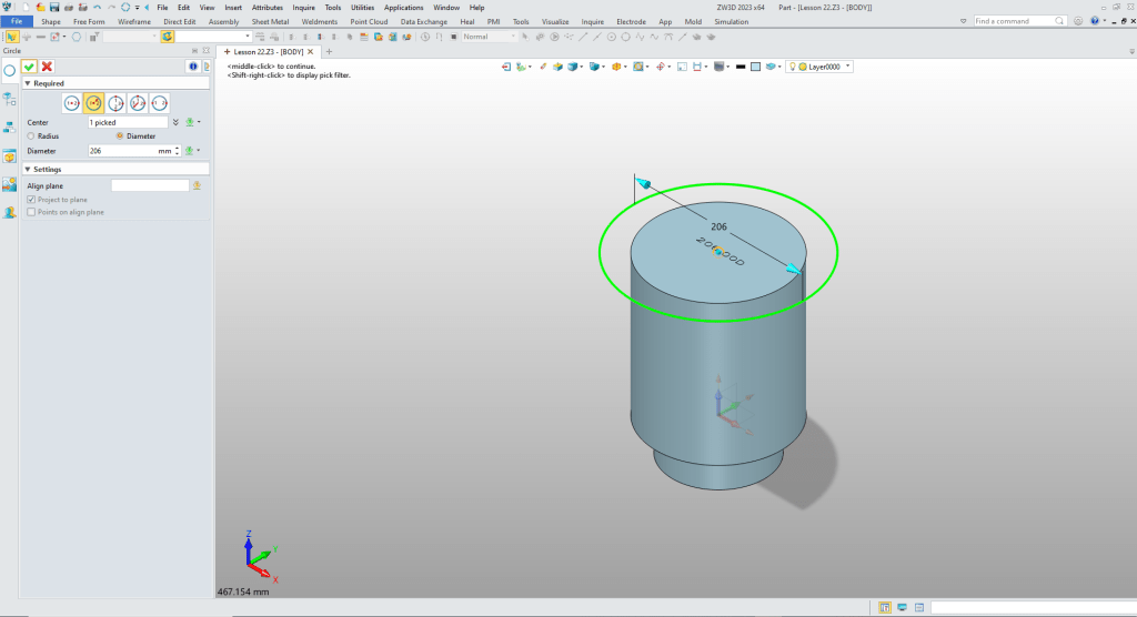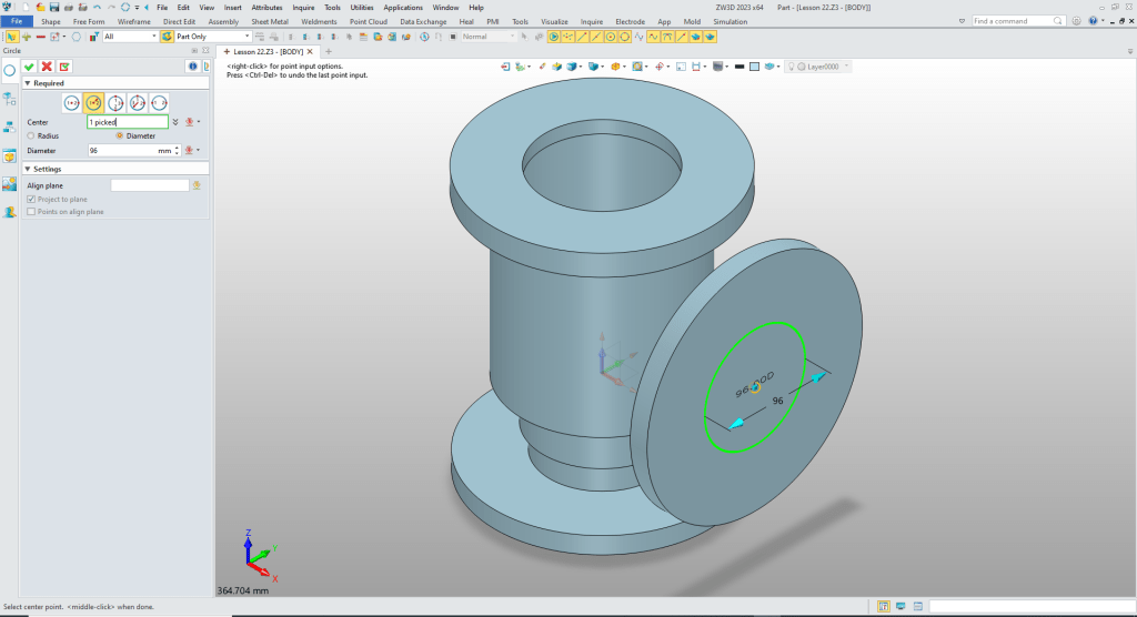 We create the flange by using the wireframe tab to create a circle using the wire at the top center of the cylinder as shown. Again ZW3D recognizes the center automatically. We size the circle.