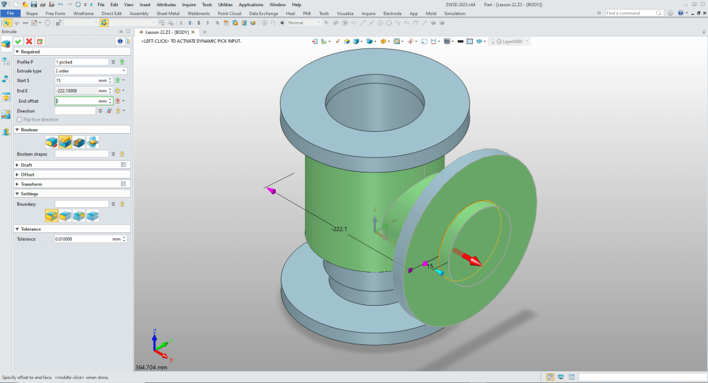We now select extrude select the outside circle and the outside edge of the cylinder and create the flange, set the depth and set to add. This saves the step of creating a sketch.
