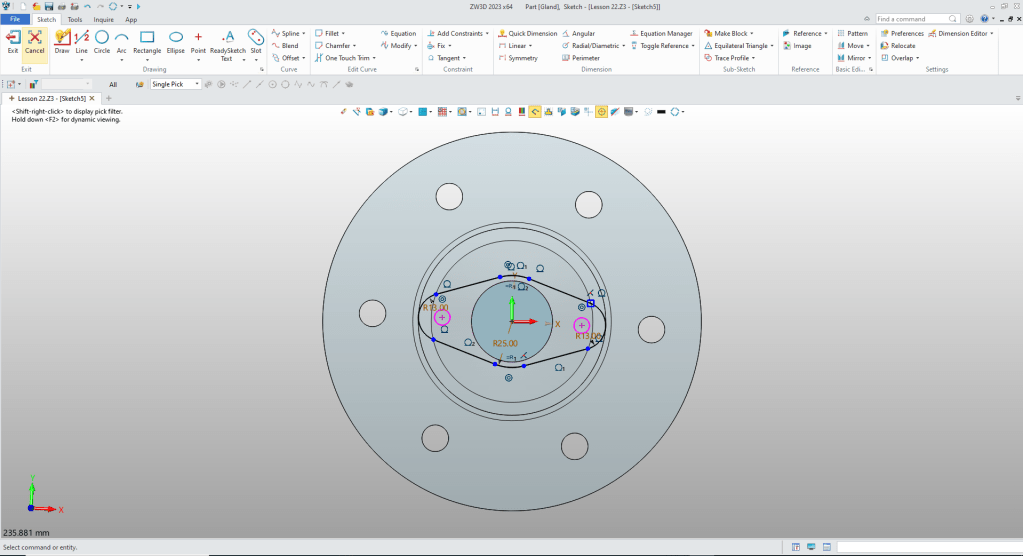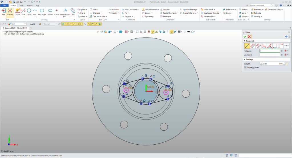 We create a sketch at the center of the cylinder. We reference the two mounting holes, create the circles using the existing centers and create the tangent lines. No constraints using StreamLined sketching.