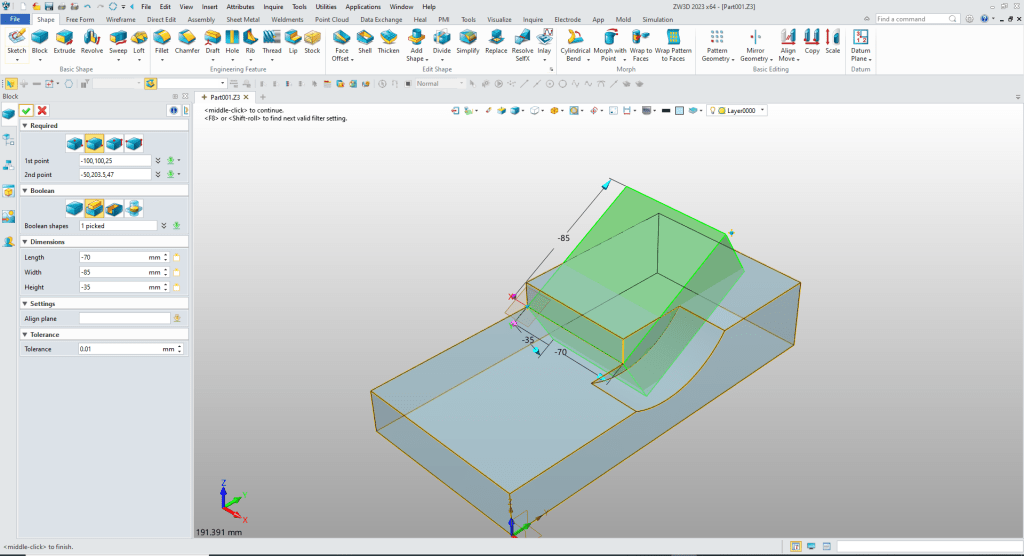 Now we have to remove the part of the resulting block. We insert another block on the diagonal face locate and size it and set it to remove.