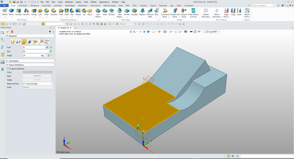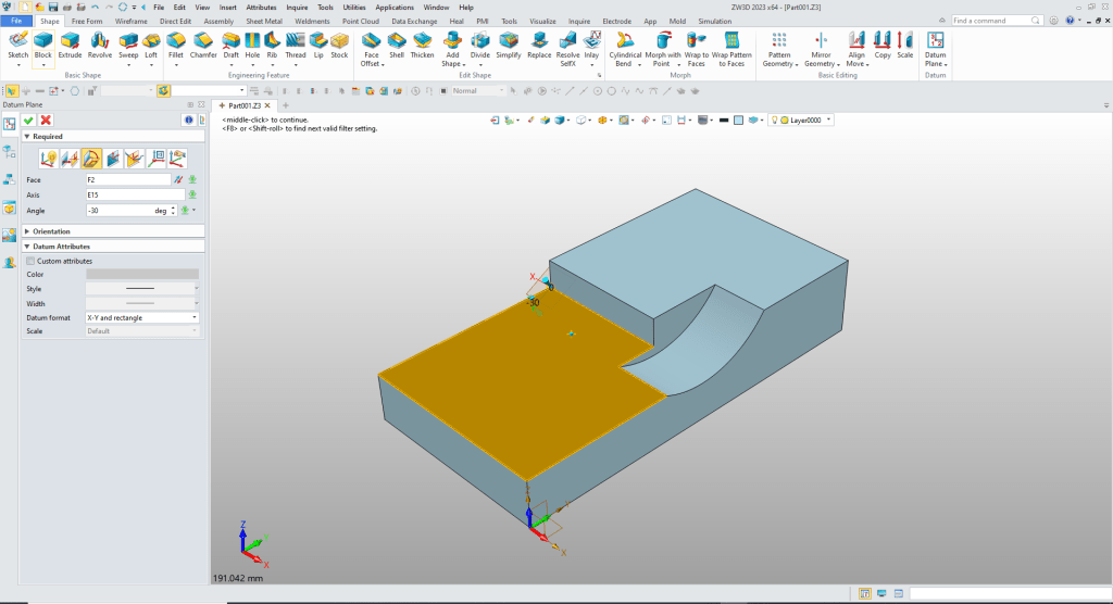 We need to create a plane at 30 degrees for the diagonal face. We select create plane angle to face, select the face, axis and angle and point for the plane. Planes are easy to create in ZW3D.