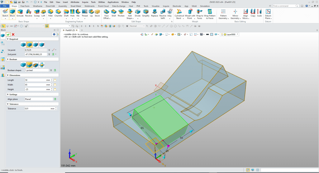 Now for the bottom shapes. Just another block on the bottom face locate, size and set it to add.