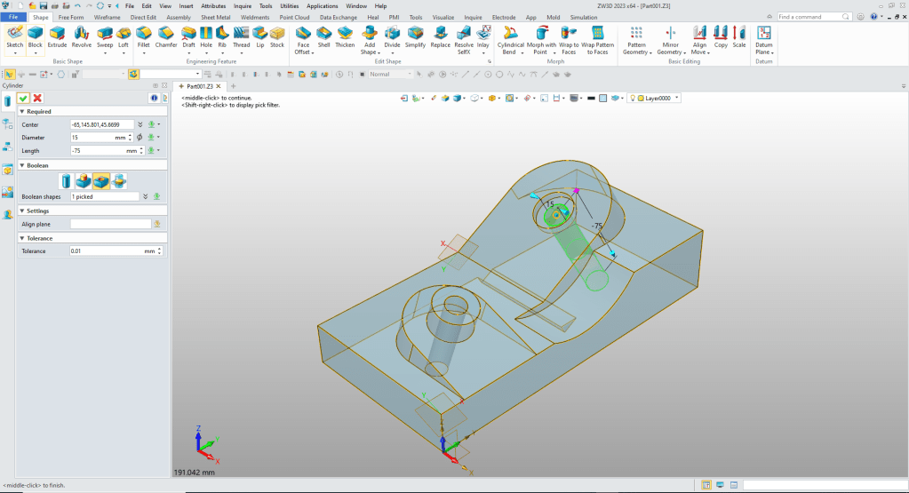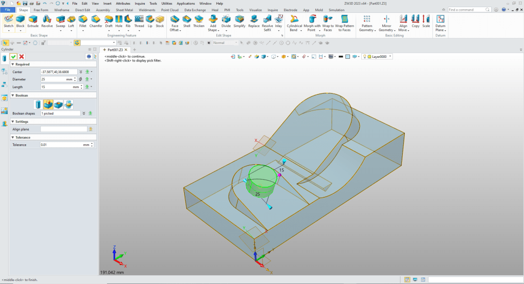 We insert a cylinder on the smaller shape, ZW3D recognizes the center and we just size it and set it to add.