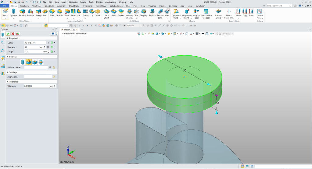 Now we insert a cylinder on the center of the large cylinder. ZW3D recognizes centers, midpoints and corners to place features. We then size and set to remove.
